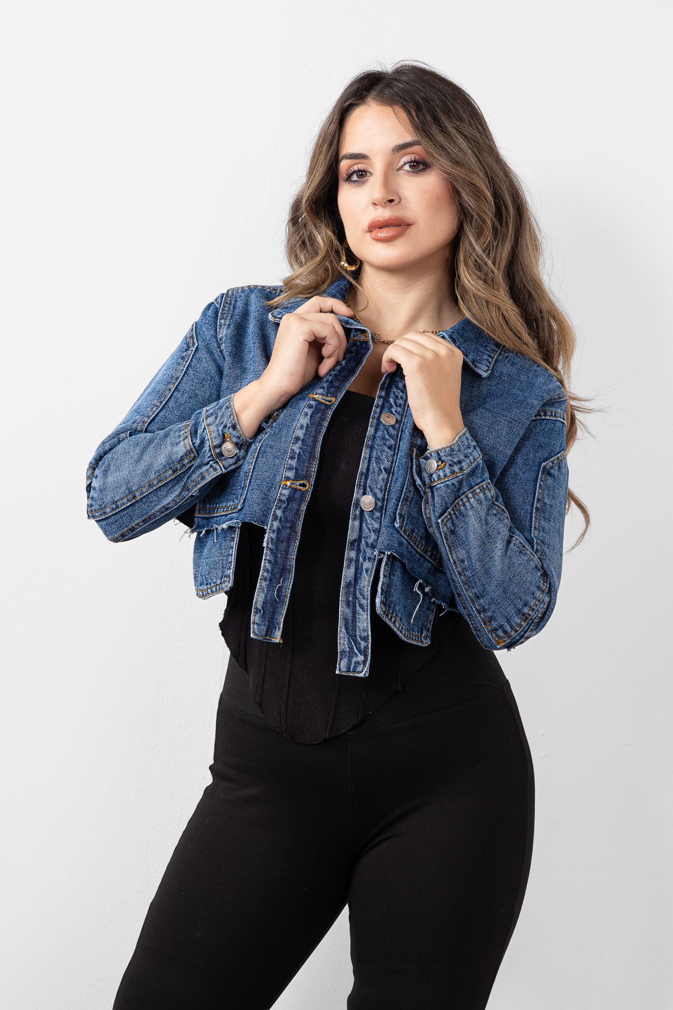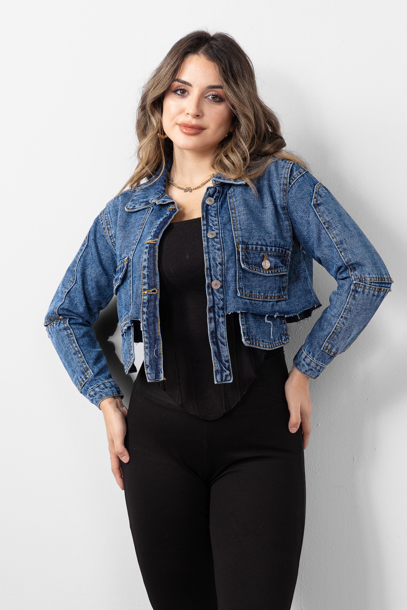 This cropped denim jacket features bold utility pockets, a boxy silhouette, and raw-cut edges that redefine casual cool.